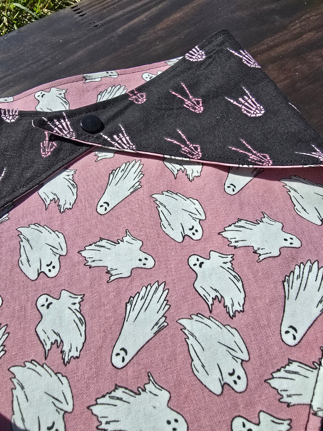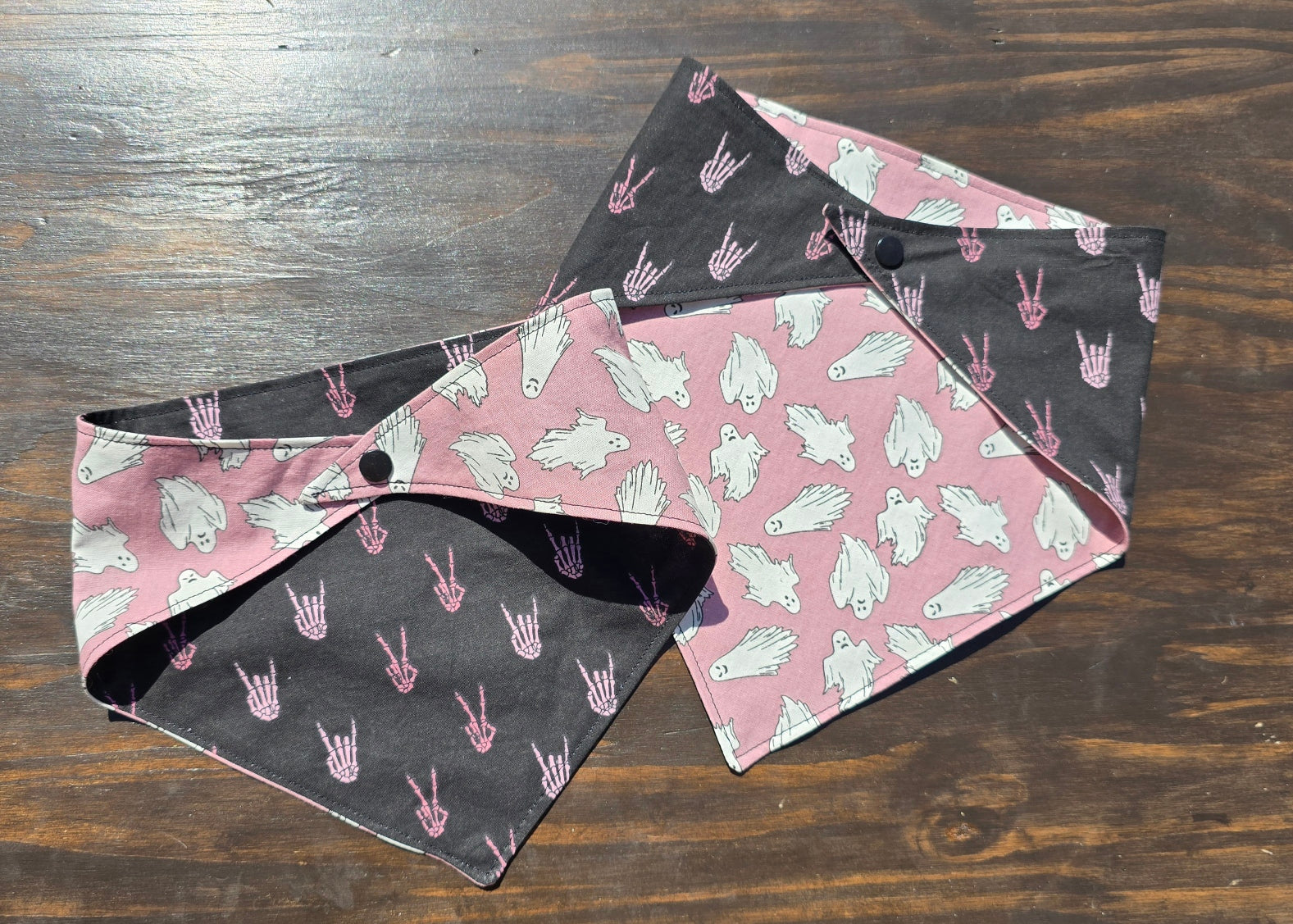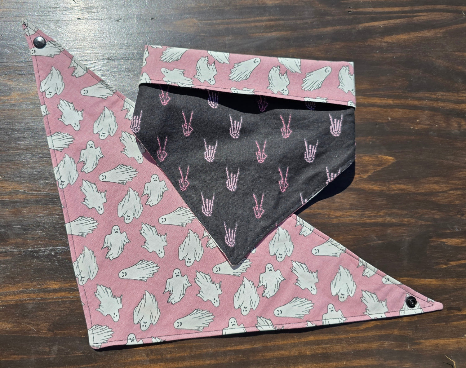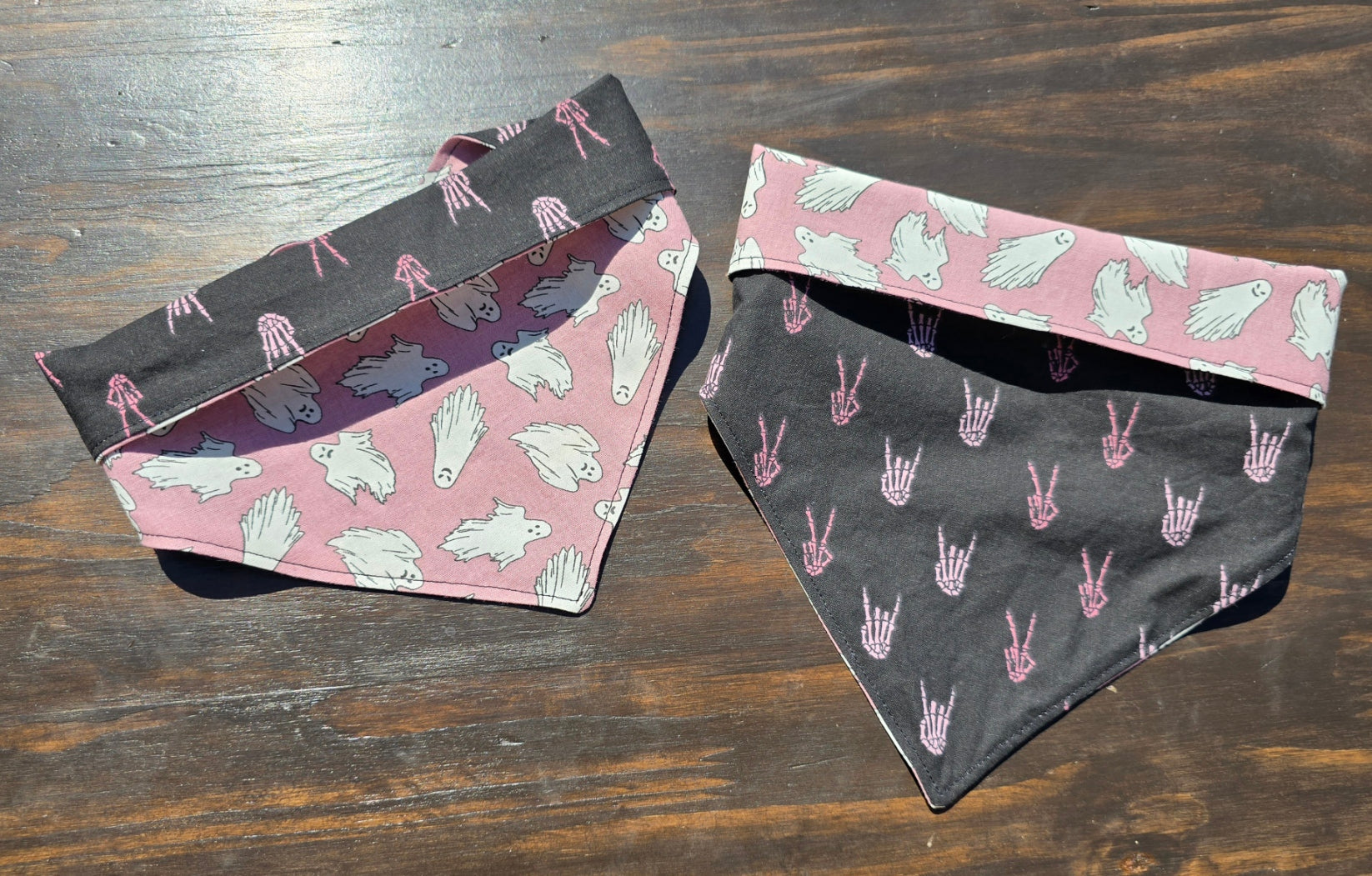 BOO! This bandana is perfect for a spooky season; One side is mauve with glow-in-the-dark ghosts, while the other has skeleton peace signs. You can personalize it however you want! Suitable for dogs, puppies, cats, and kittens. And the best part? It snaps on for easy wear! Happy Halloween! Add personalization to any bandana with the "Bandana Personalization" listing