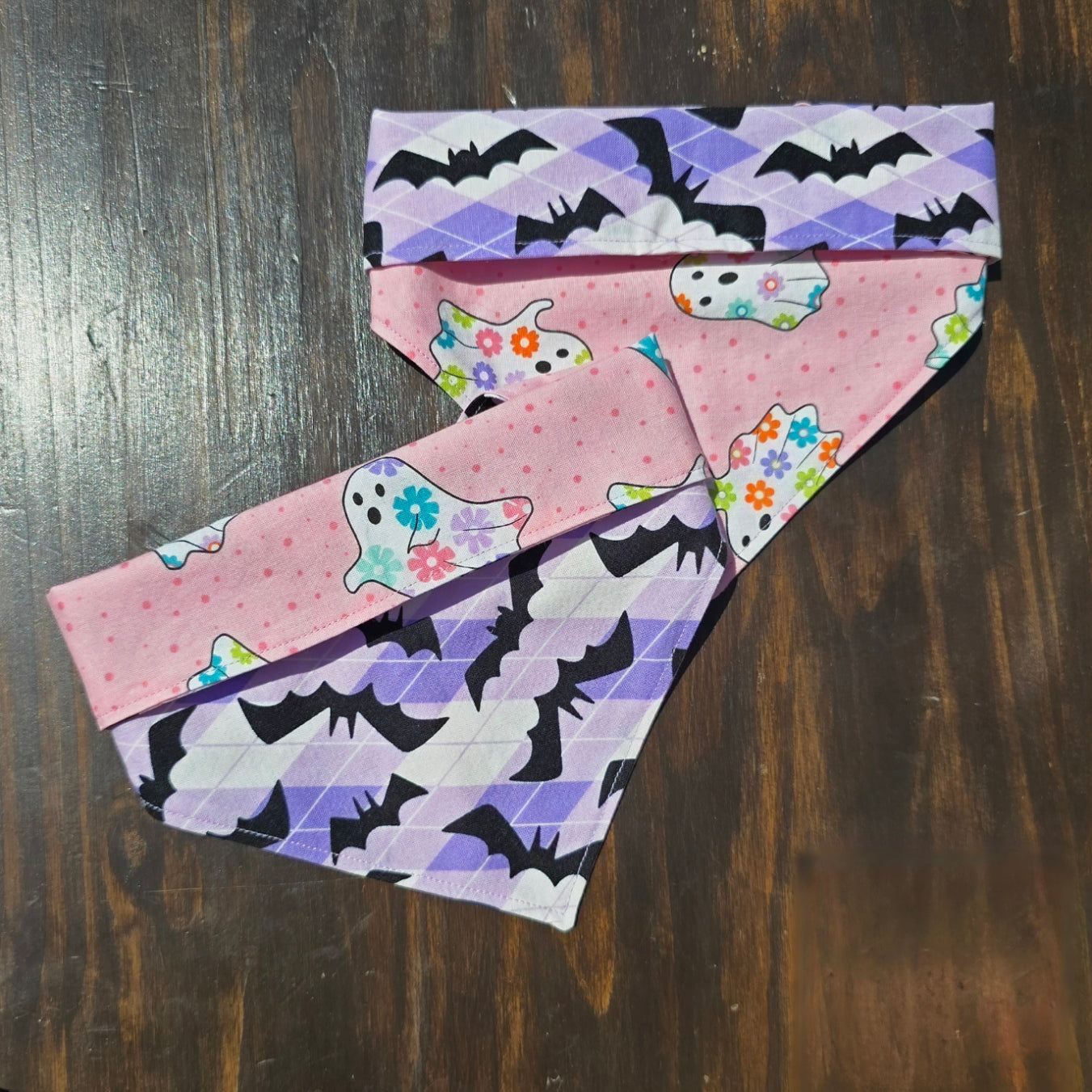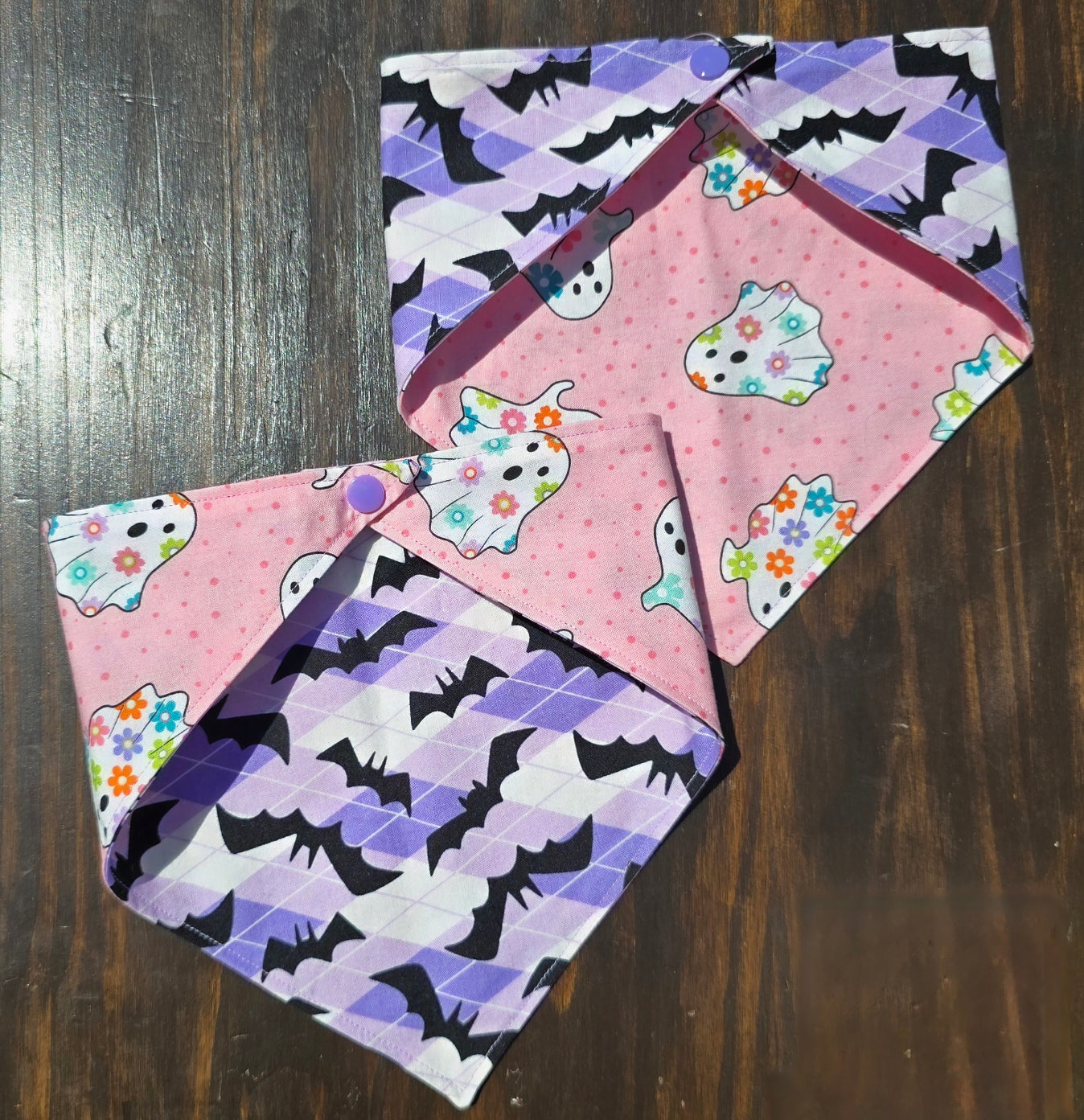 Snap-on & reversible. Cute meets spooky with this reversible bandana! One side features colorful flower-adorned ghosts on a pink background, while the other shows off bold black bats flying across purple skies. Perfect for pups who like their Halloween style sweet and spooky!