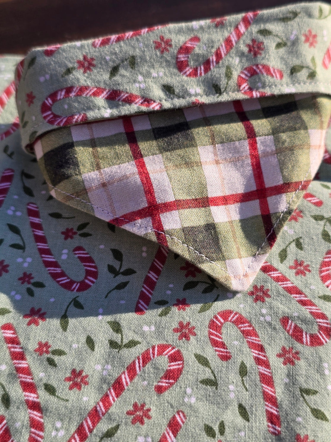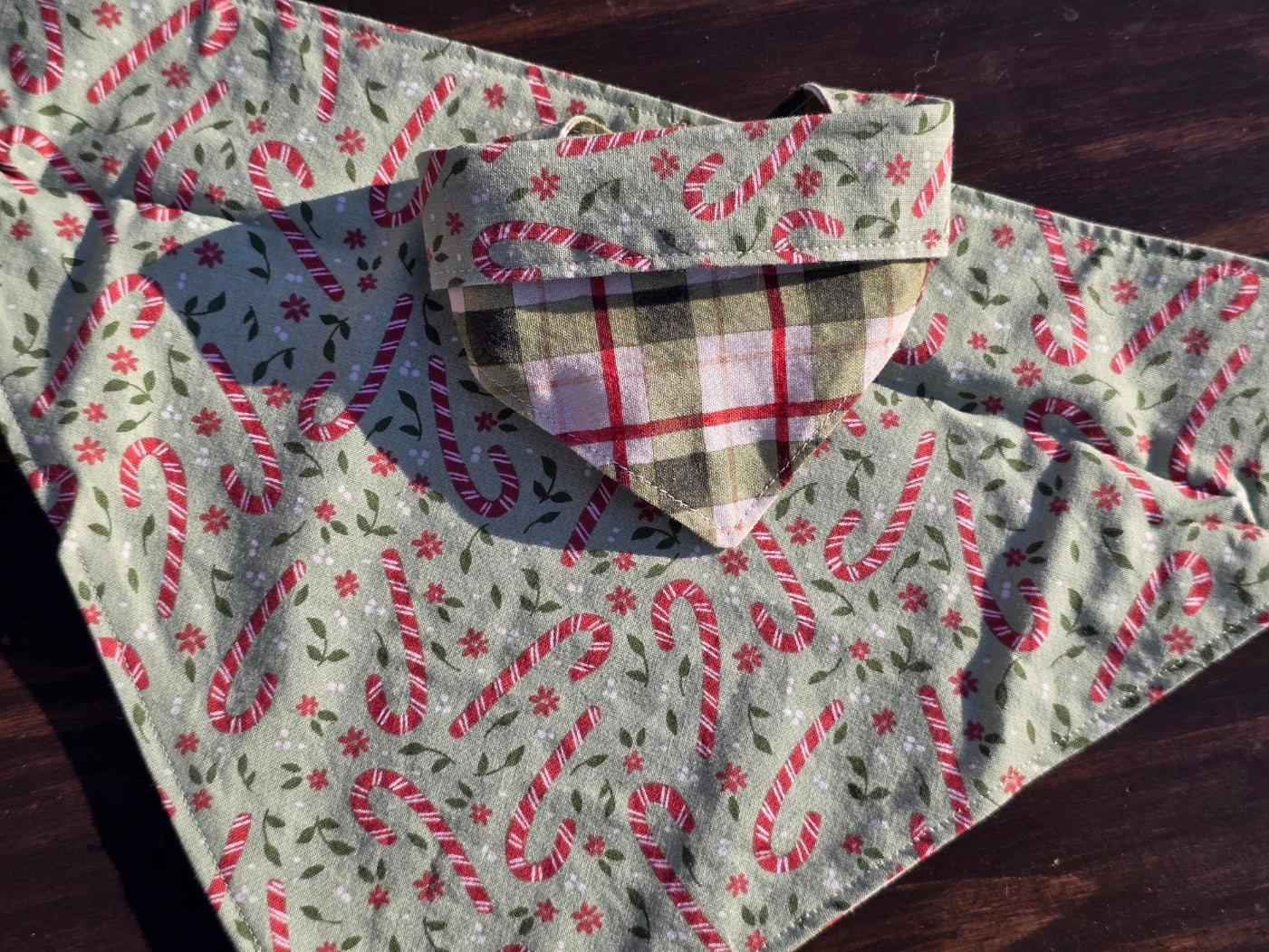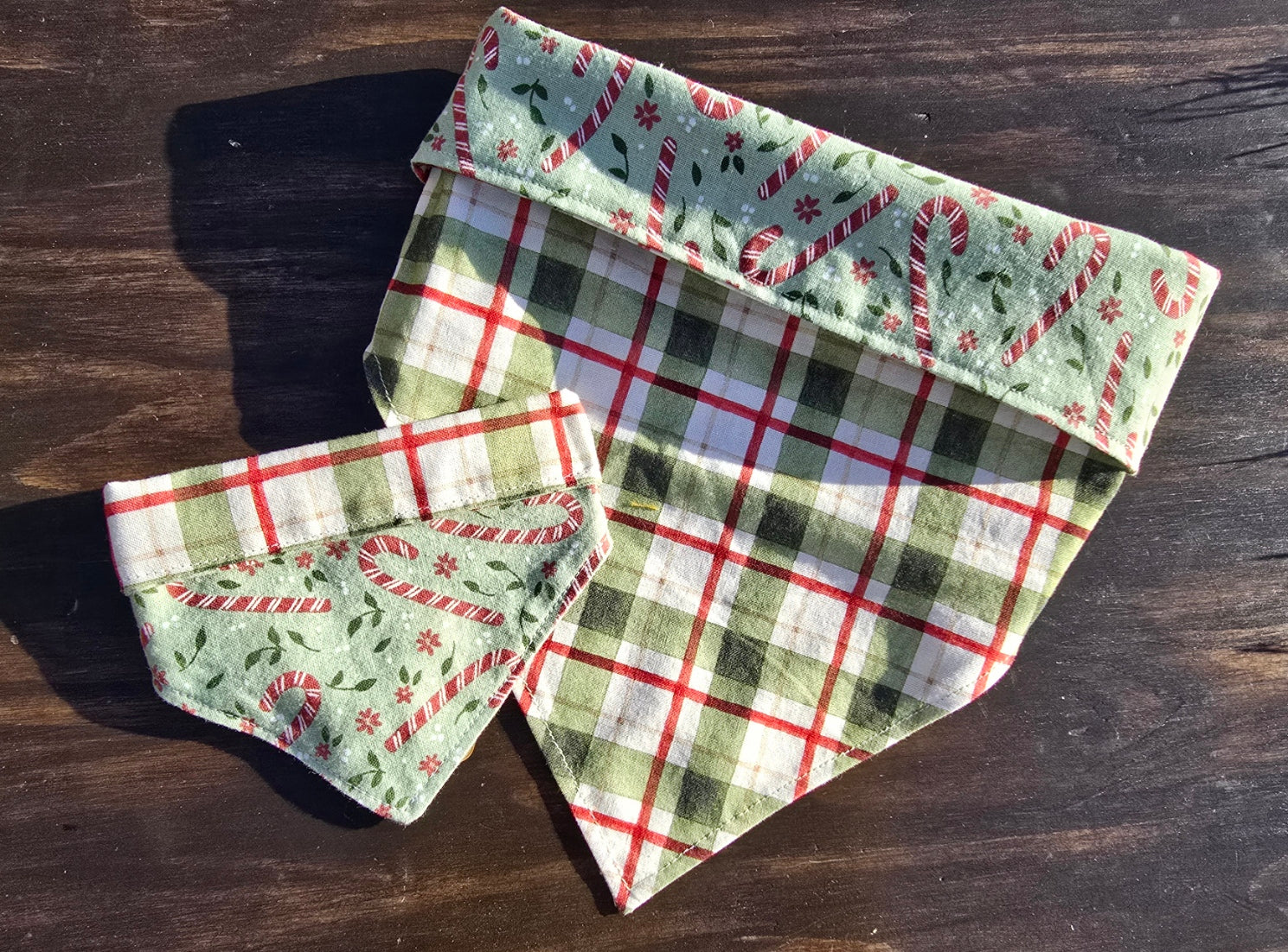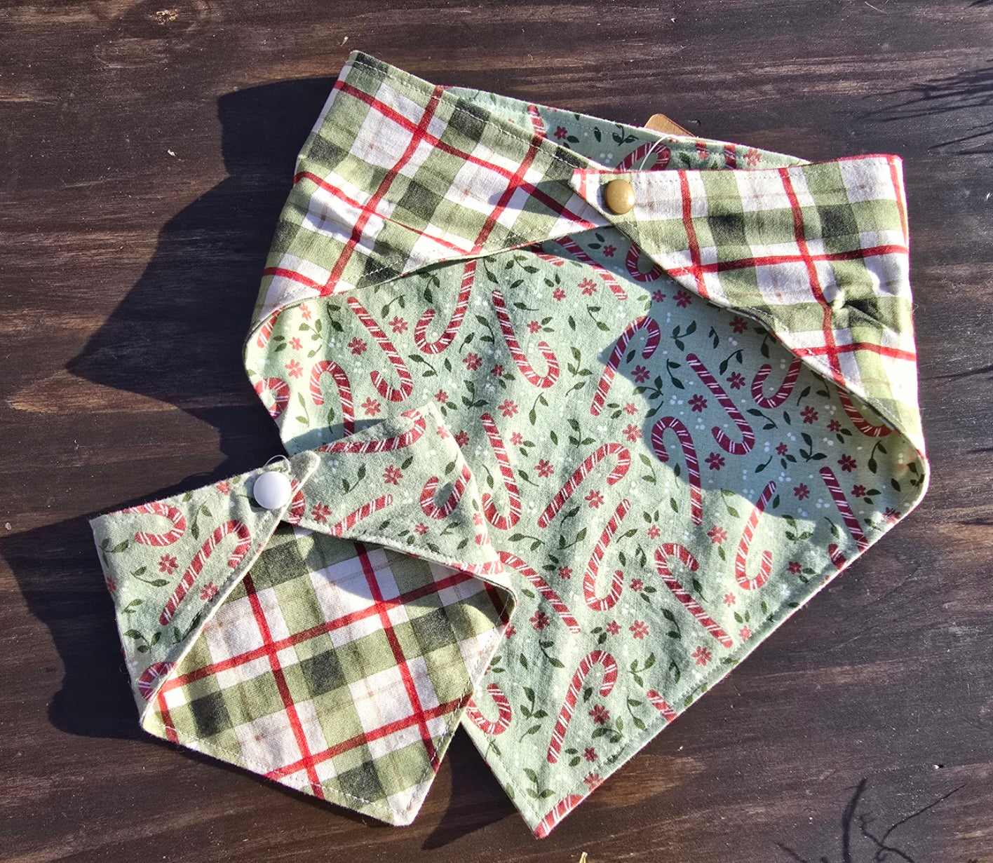 Get your furry friend ready for the holiday season with our Snowman bandana! The reversible bandana features a, metallic plaid on one side and a festive snowman on the other. It is perfect for dogs, puppies, cats, and kittens. Personalize it to make it even more special!