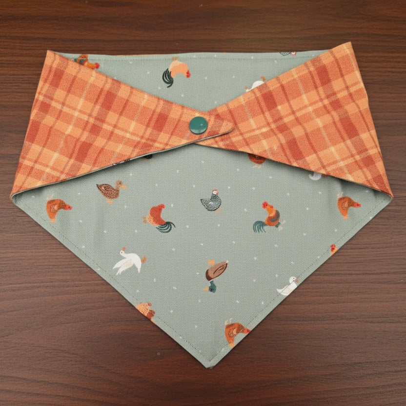 Where farmhouse meets fall fashion — playful chickens meet warm plaid in this adorable, country-cute bandana. Country-inspired Everyday Reversible Snap-on Pet Bandana: Personalize it any way you'd like!