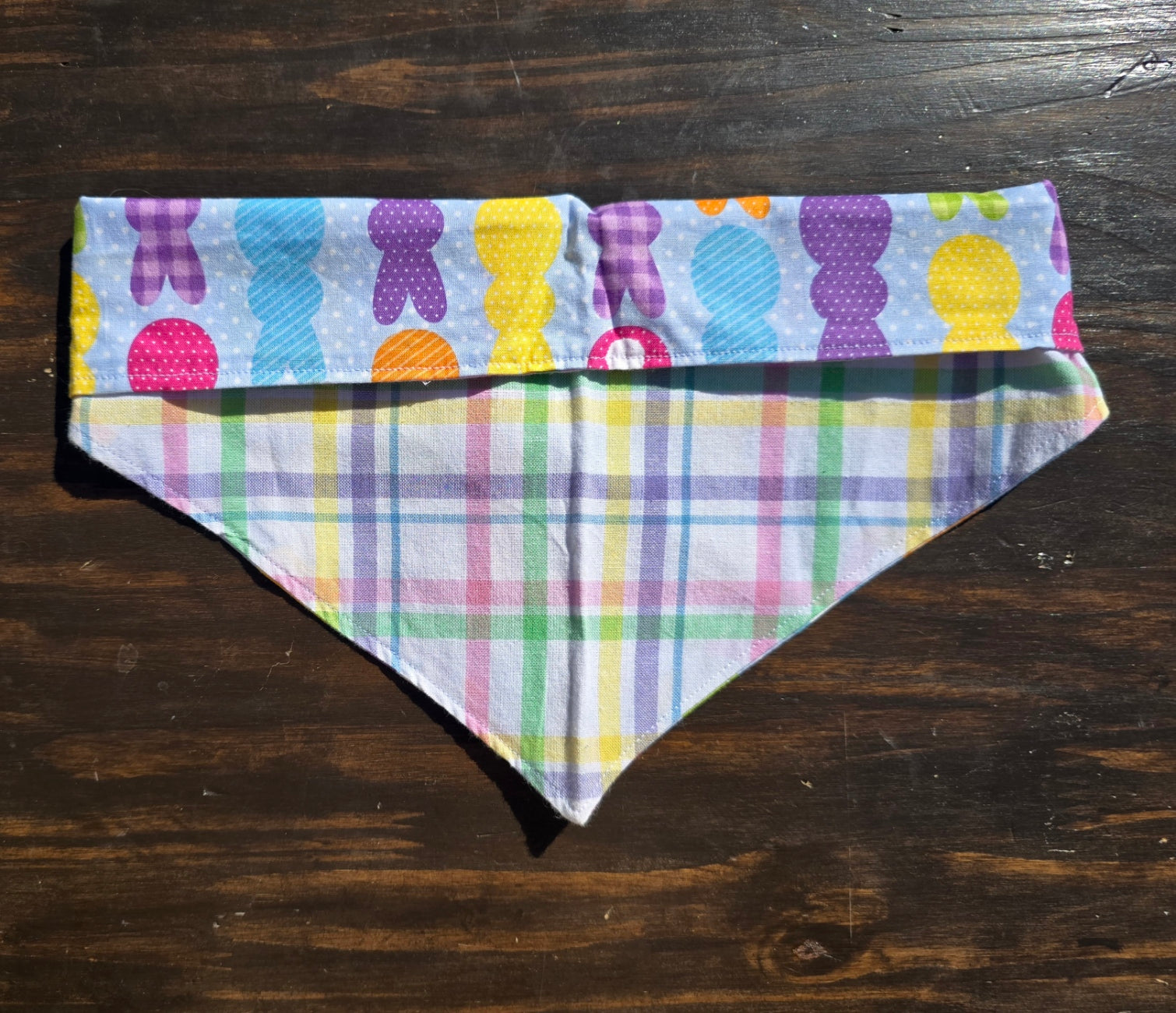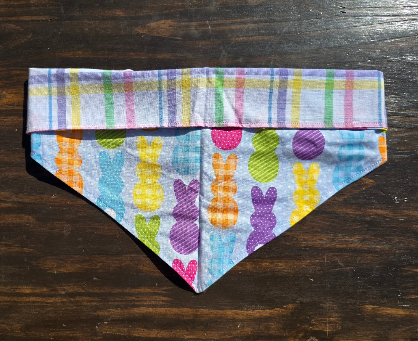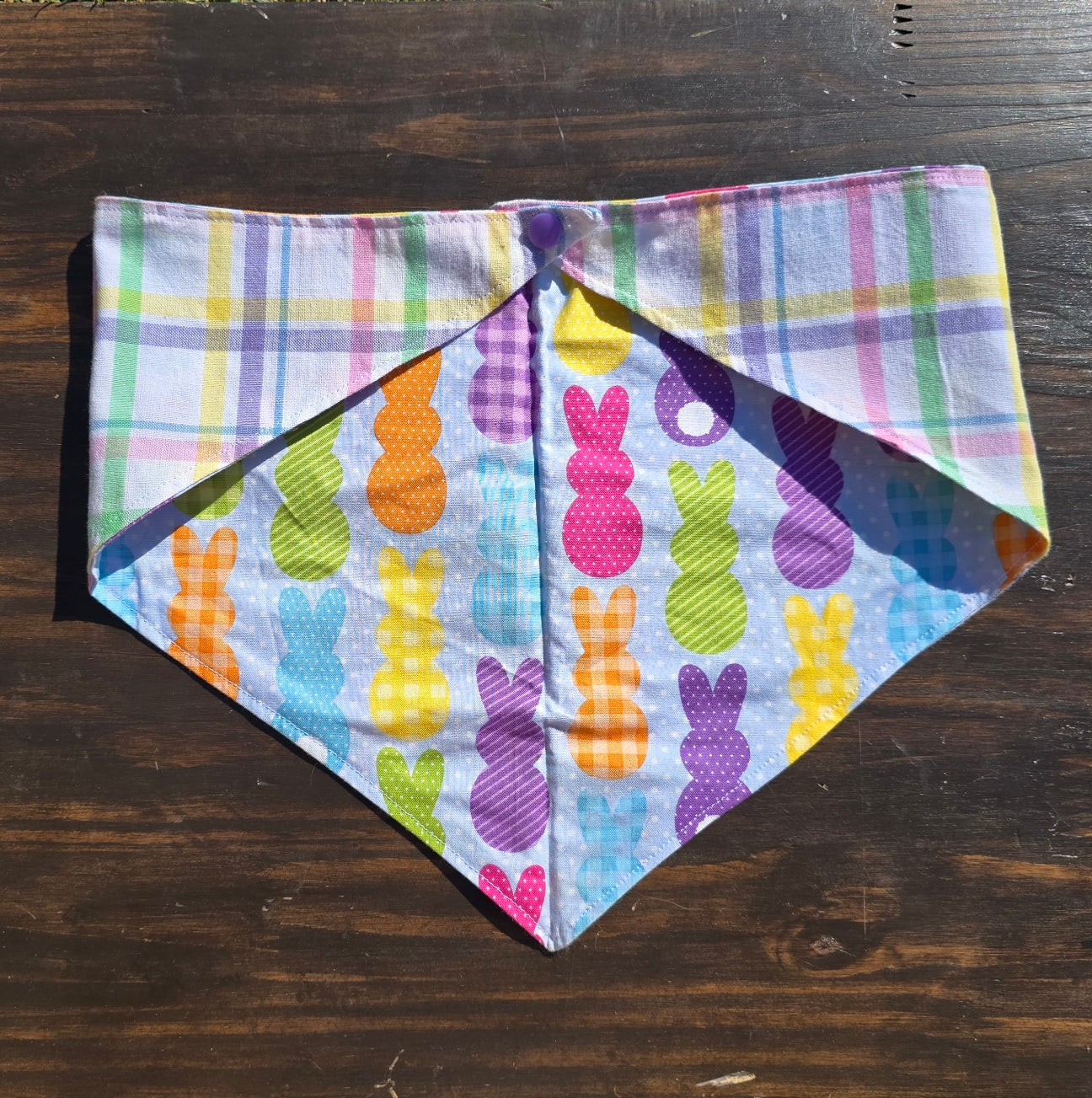 Celebrate spring with this adorable reversible bandana! One side showcases pastel plaid, while the other features bunnies—perfect for festive fun! Reversible Snap-on Pet Bandana: Personalize it any way you'd like!