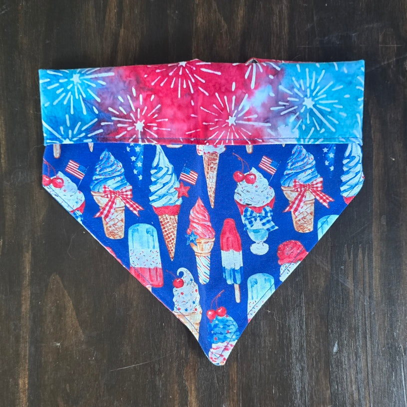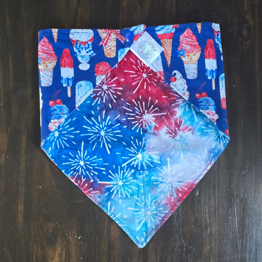 A fun reversible bandana featuring cool ice cream cones on one side and bold red, white, and blue fireworks on the other—perfect for summer celebrations. Reversible Snap-on Pet Bandana: Personalize it any way you'd like! Add personalization to any bandana with the "Bandana Personalization" listing
