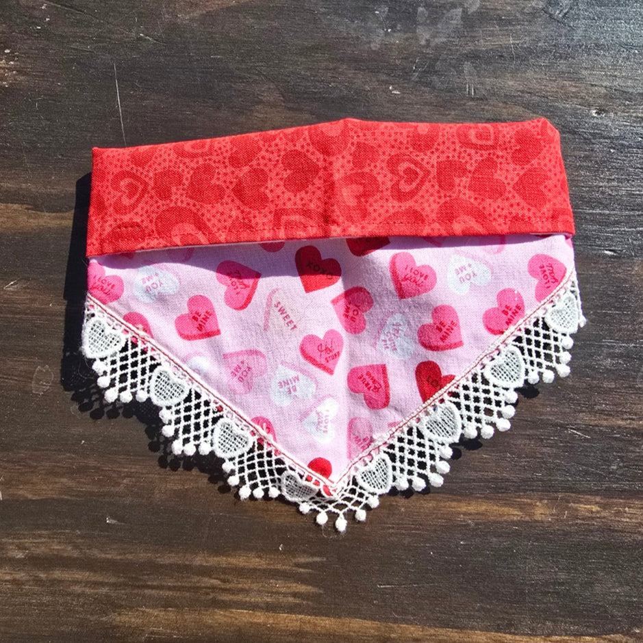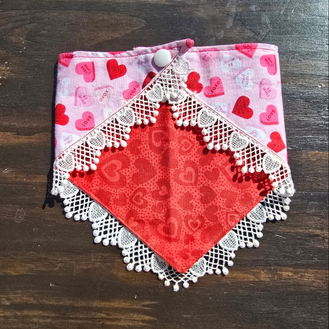 Dress your furry friend in love with this charming Valentine’s Day bandana! Featuring a playful pink background covered in love hearts, a bold red heart-patterned center, and delicate white lace trim, this snap-on accessory is both stylish and comfortable. Perfect for adding a touch of romance and cuteness to your pet’s look, whether for a Valentine’s photo shoot or just extra cuddles at home.