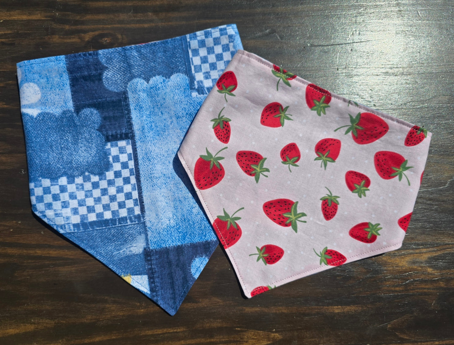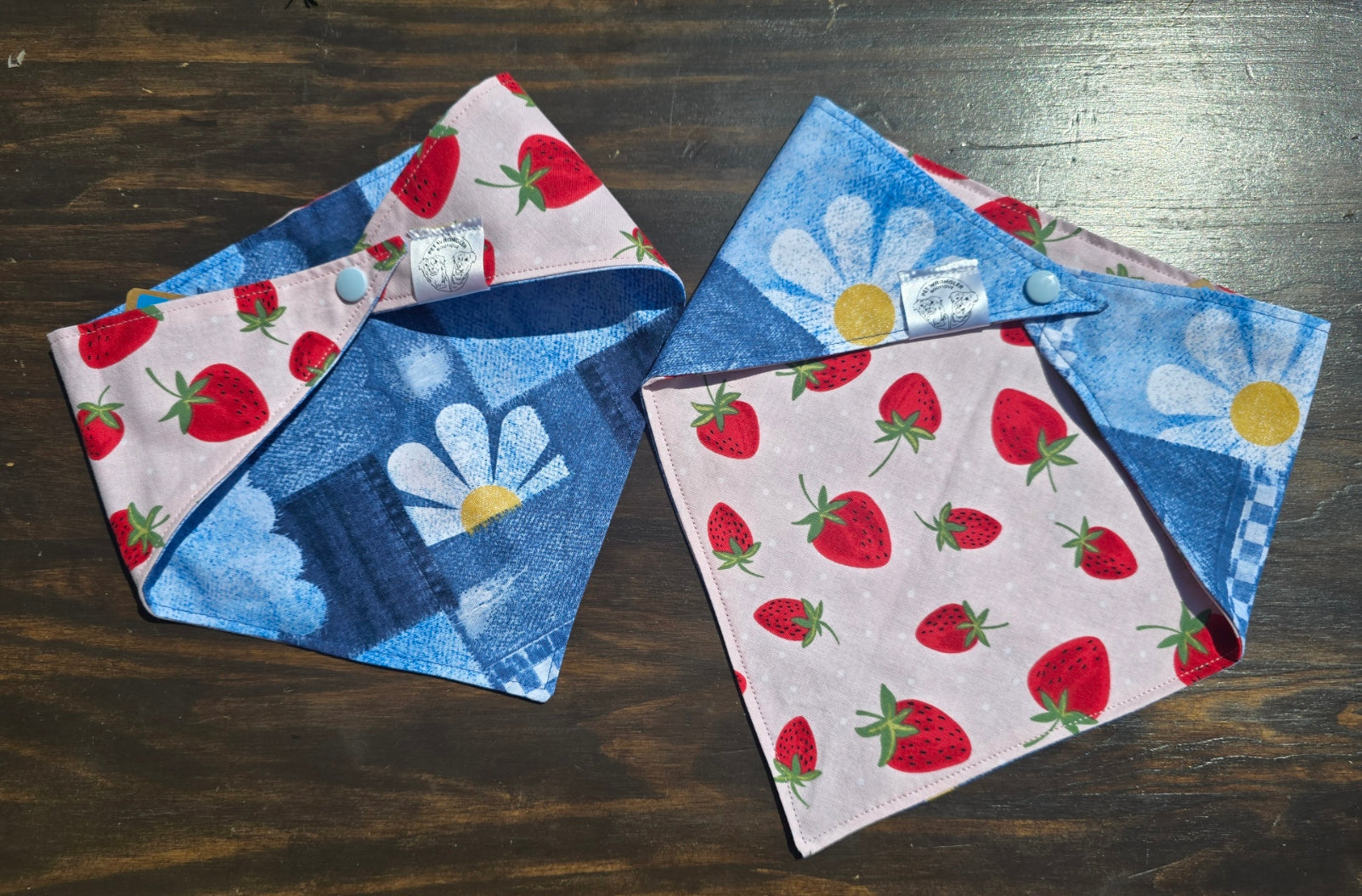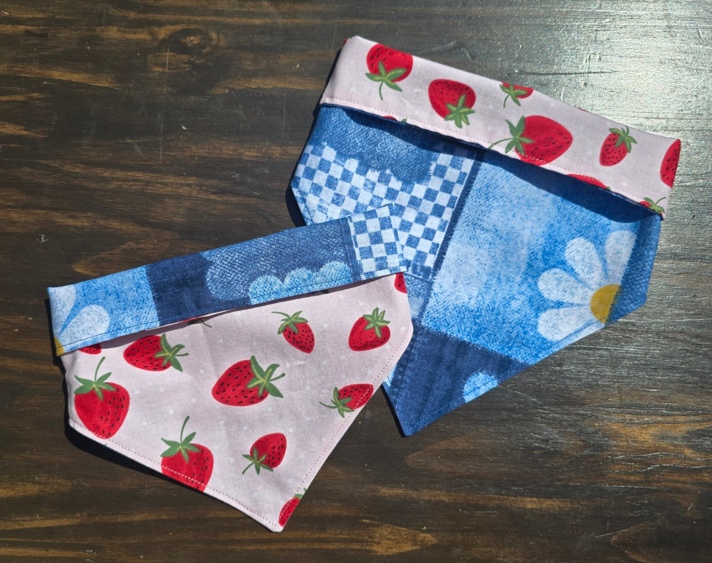 Perfectly adorable strawberry bandana for the spring and summer! One side is pink with strawberry's, the other is blue patchwork with daisies.