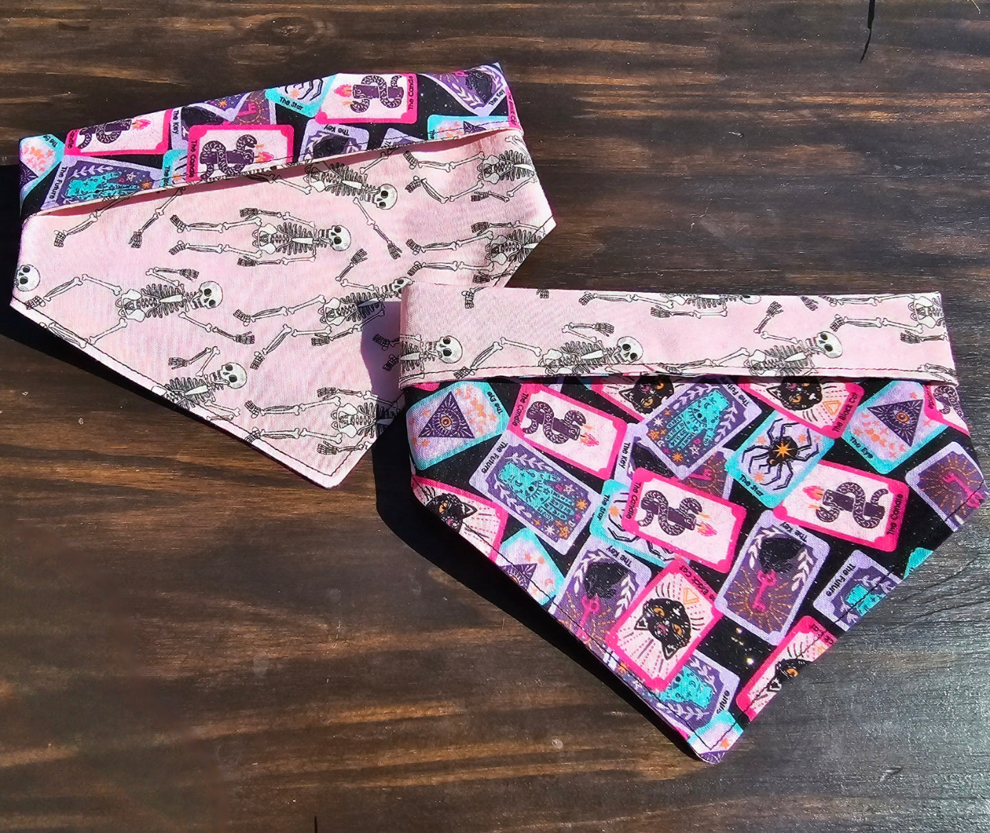BOO! This bandana is perfect for a spooky season; One side is light pink with dancing skeletons, while the other has glittery tarot cards. You can personalize it however you want! Suitable for dogs, puppies, cats, and kittens. And the best part? It snaps on for easy wear! Happy Halloween! Add personalization to any bandana with the "Bandana Personalization" listing