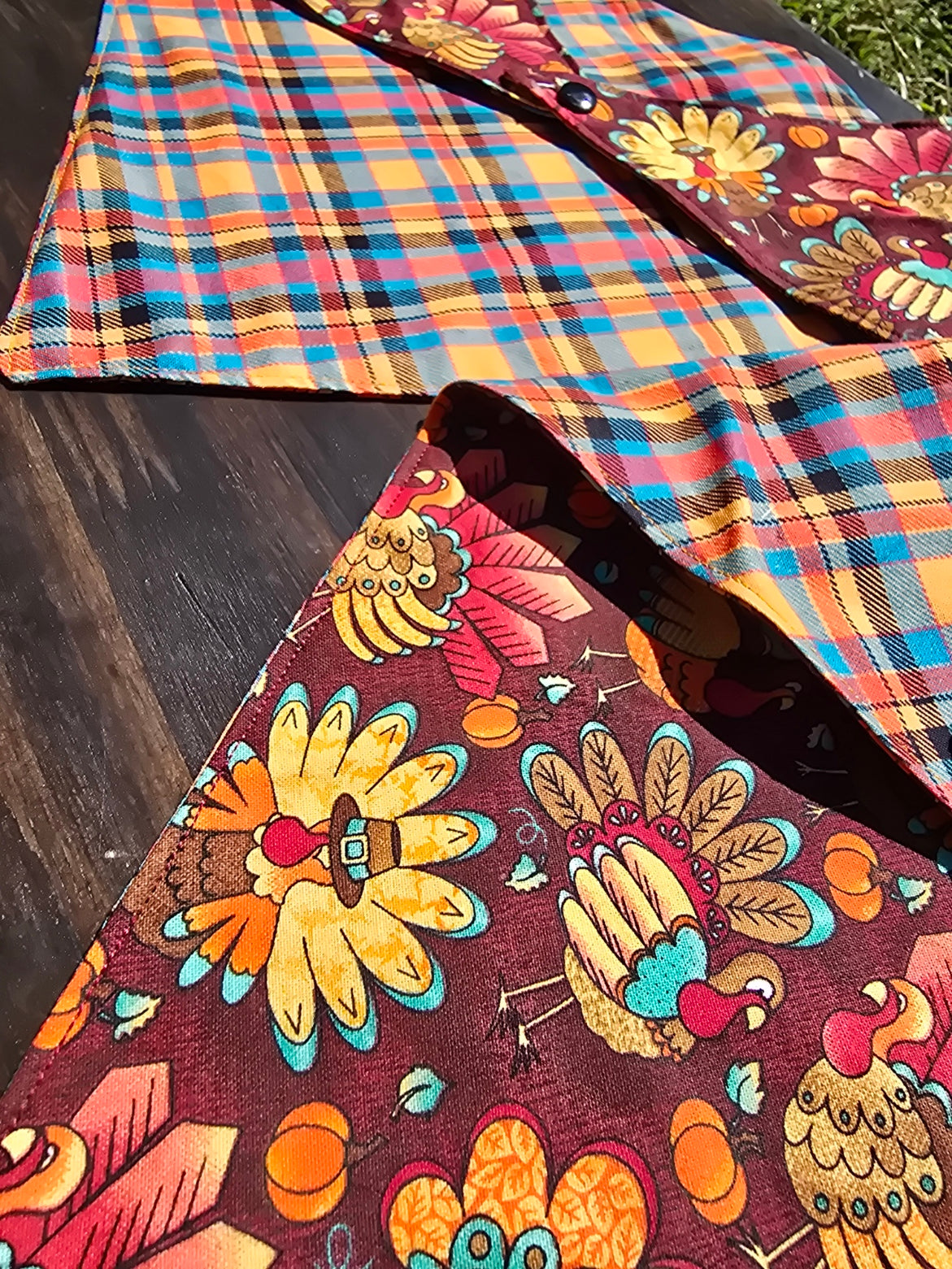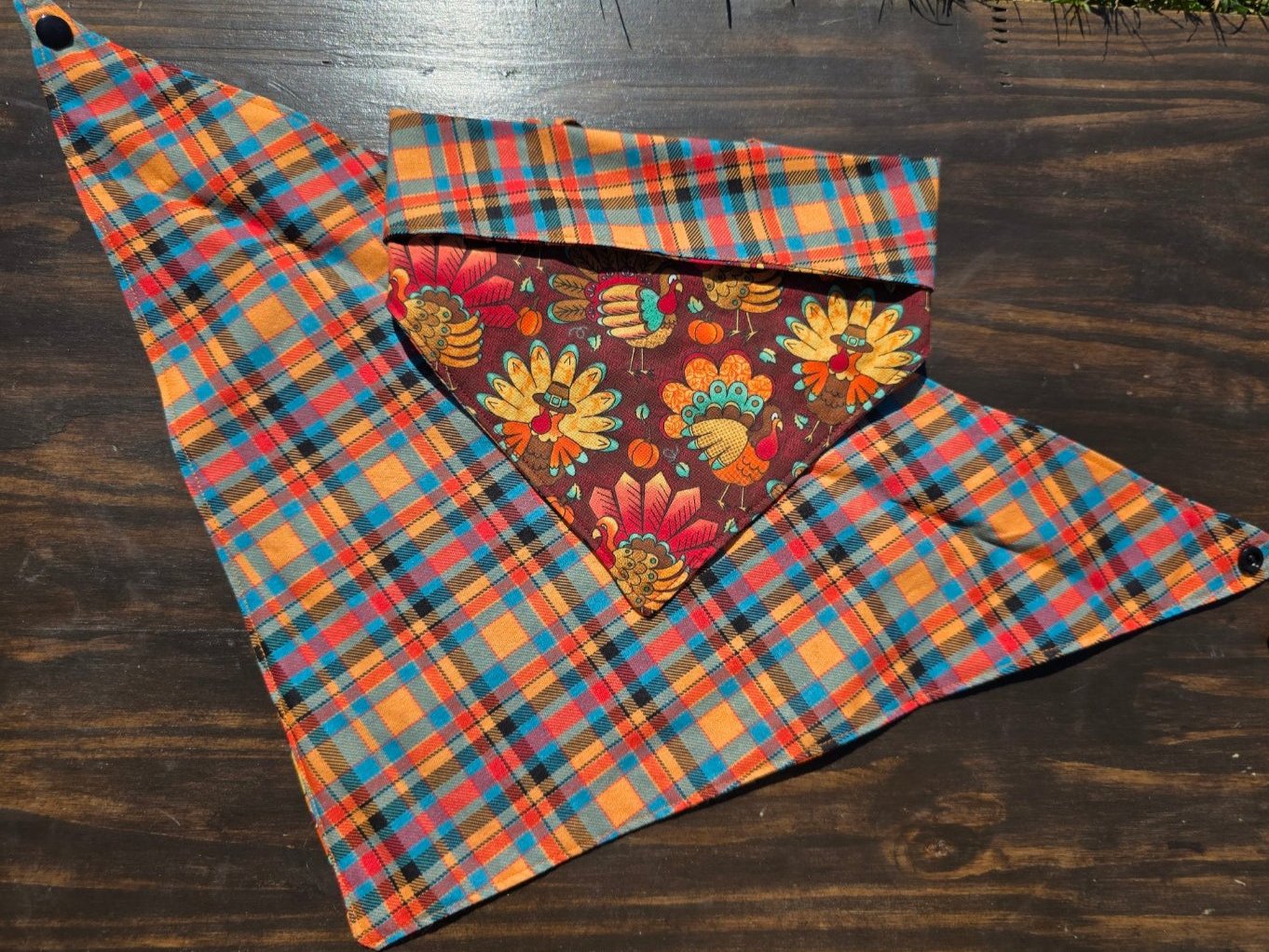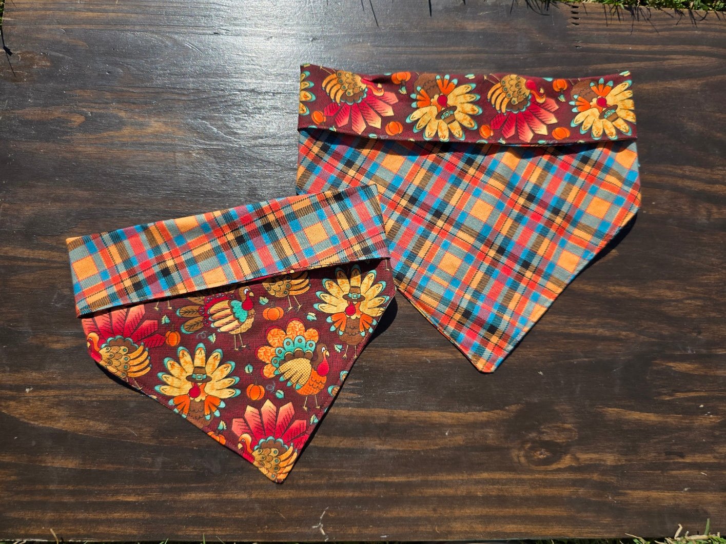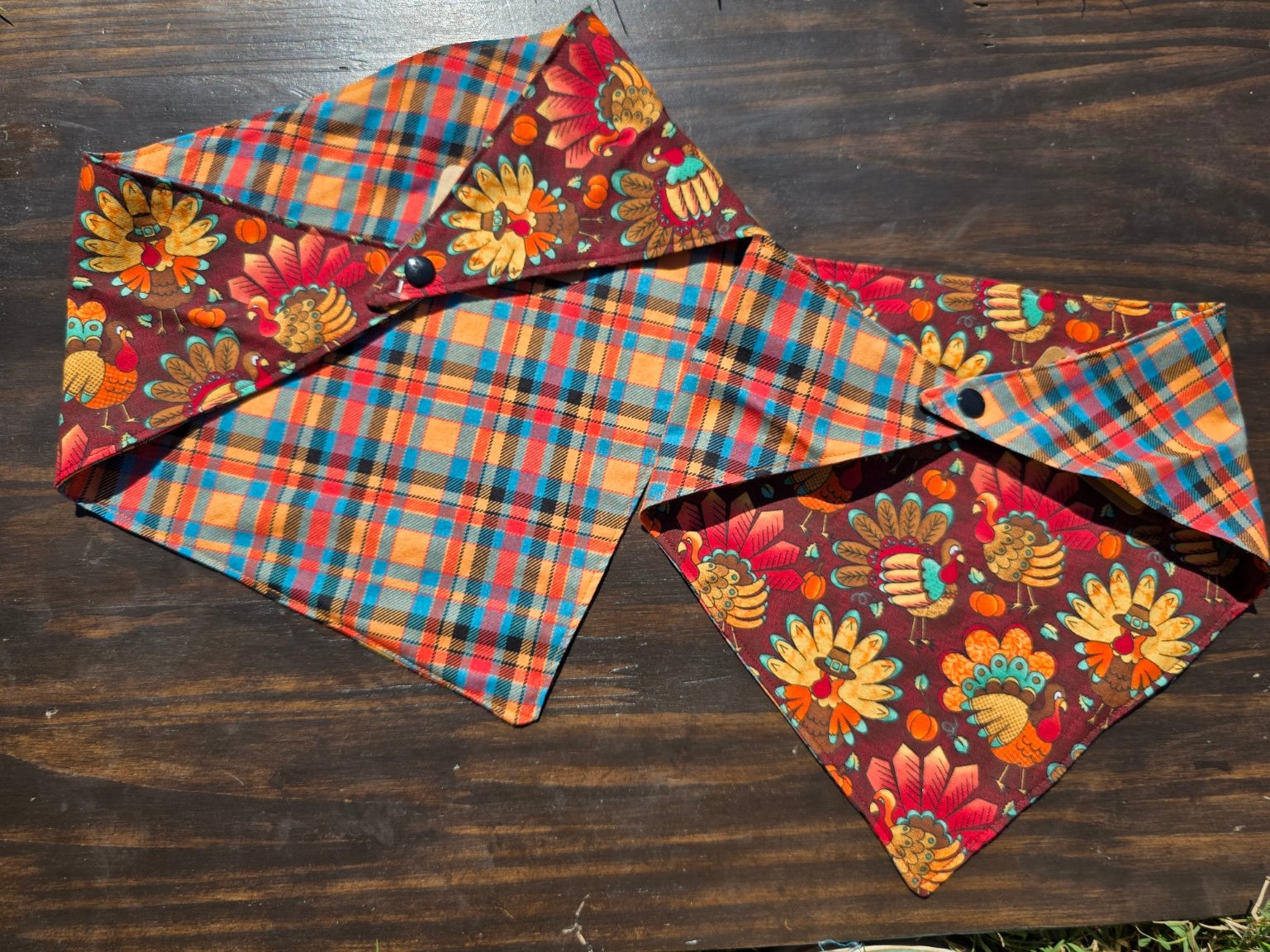 Gobble Gobble! This bandana is perfect for fall! One side is Turkeys, while the other has plaid. You can personalize it however you want! Suitable for dogs, puppies, cats, and kittens. And the best part? It snaps on for easy wear! Happy Fall Y'all! Add personalization to any bandana with the "Bandana Personalization" listing