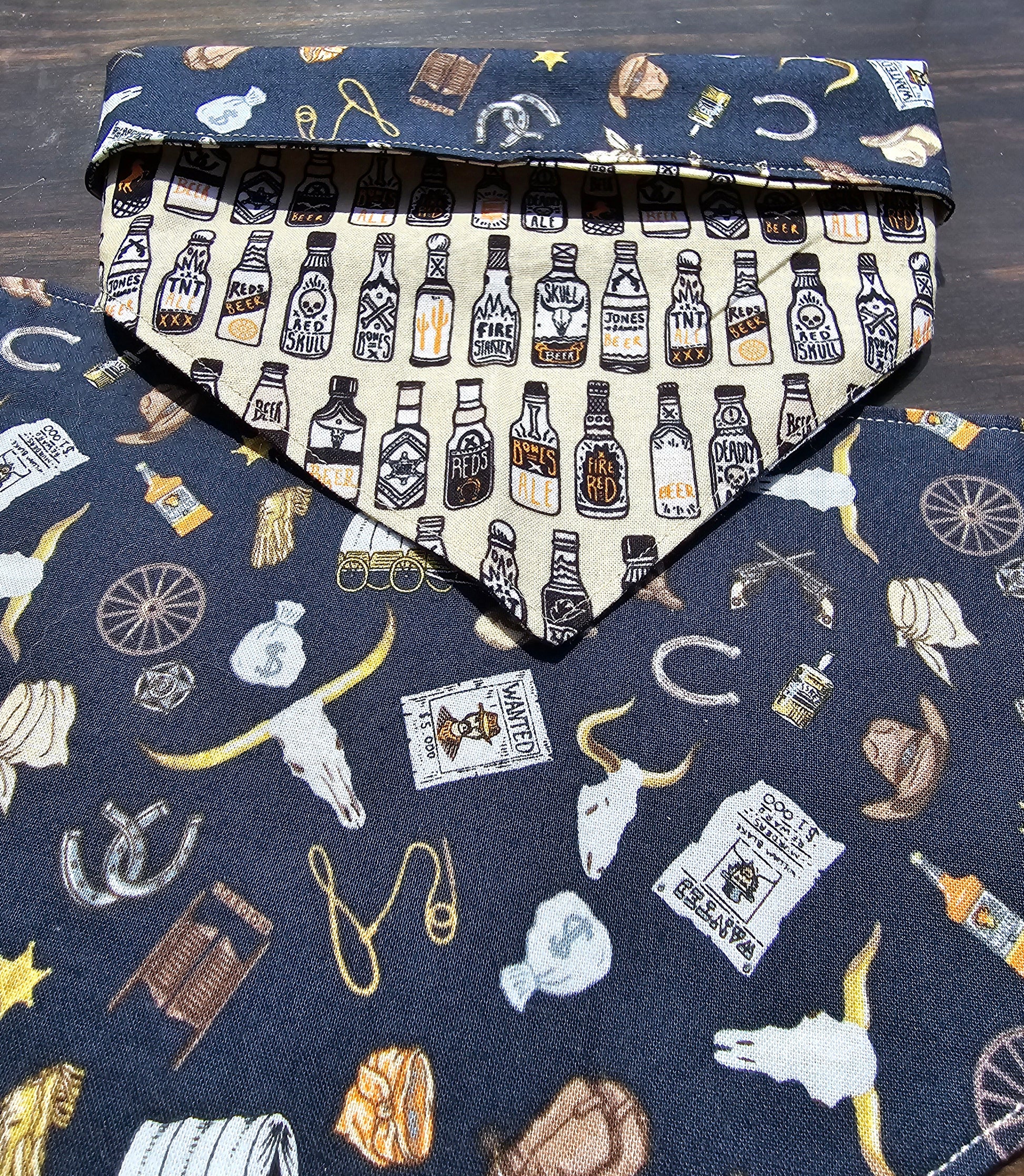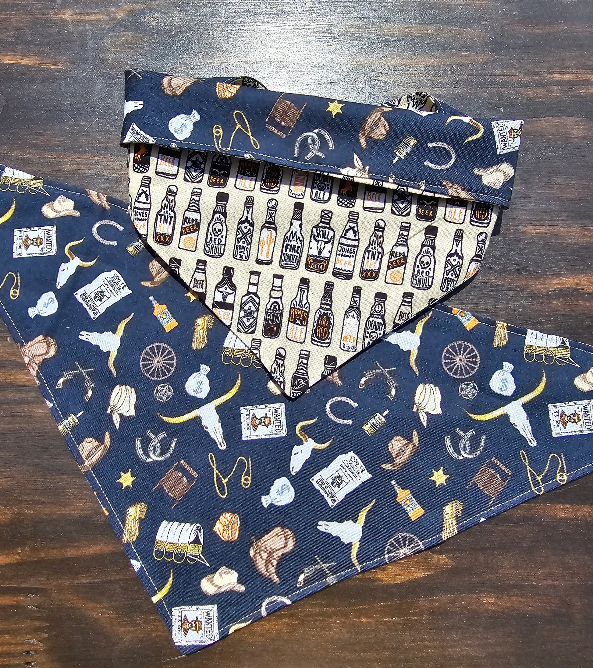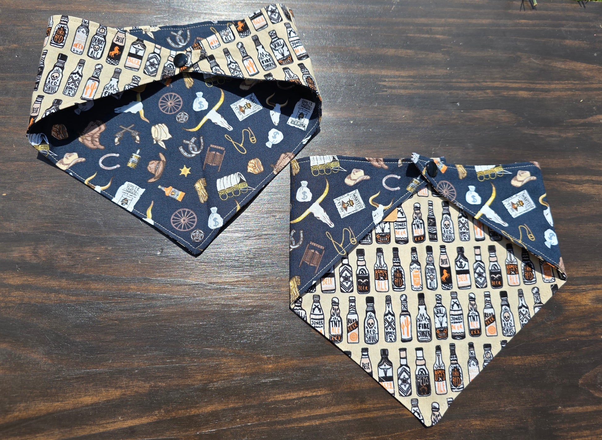 Reversible Snap-on Pet Bandana: Personalize it any way you like! It's the perfect everyday bandana! This bandana has spooky-themed beer bottles on one side, while the other is old west themed! Add personalization to any bandana with the "Bandana Personalization" listing