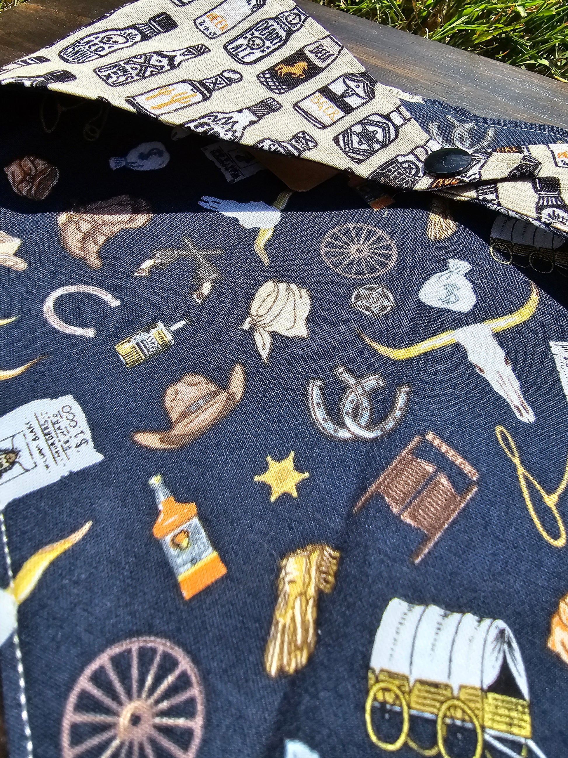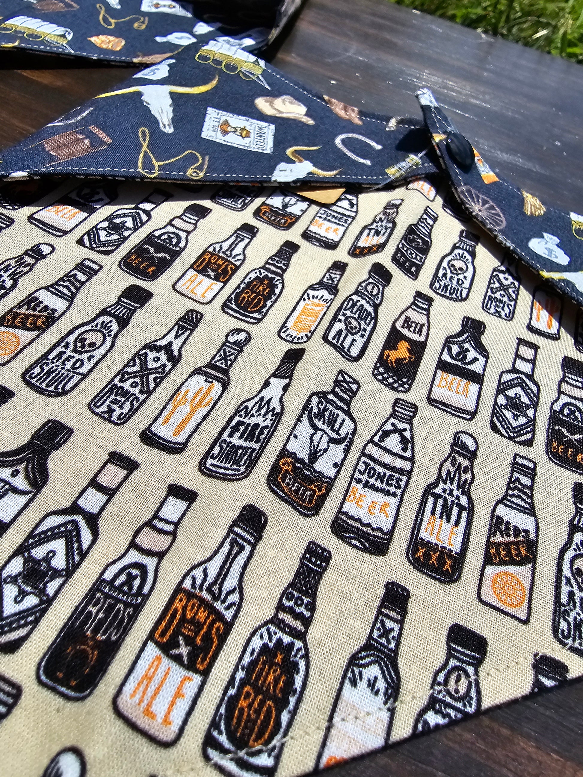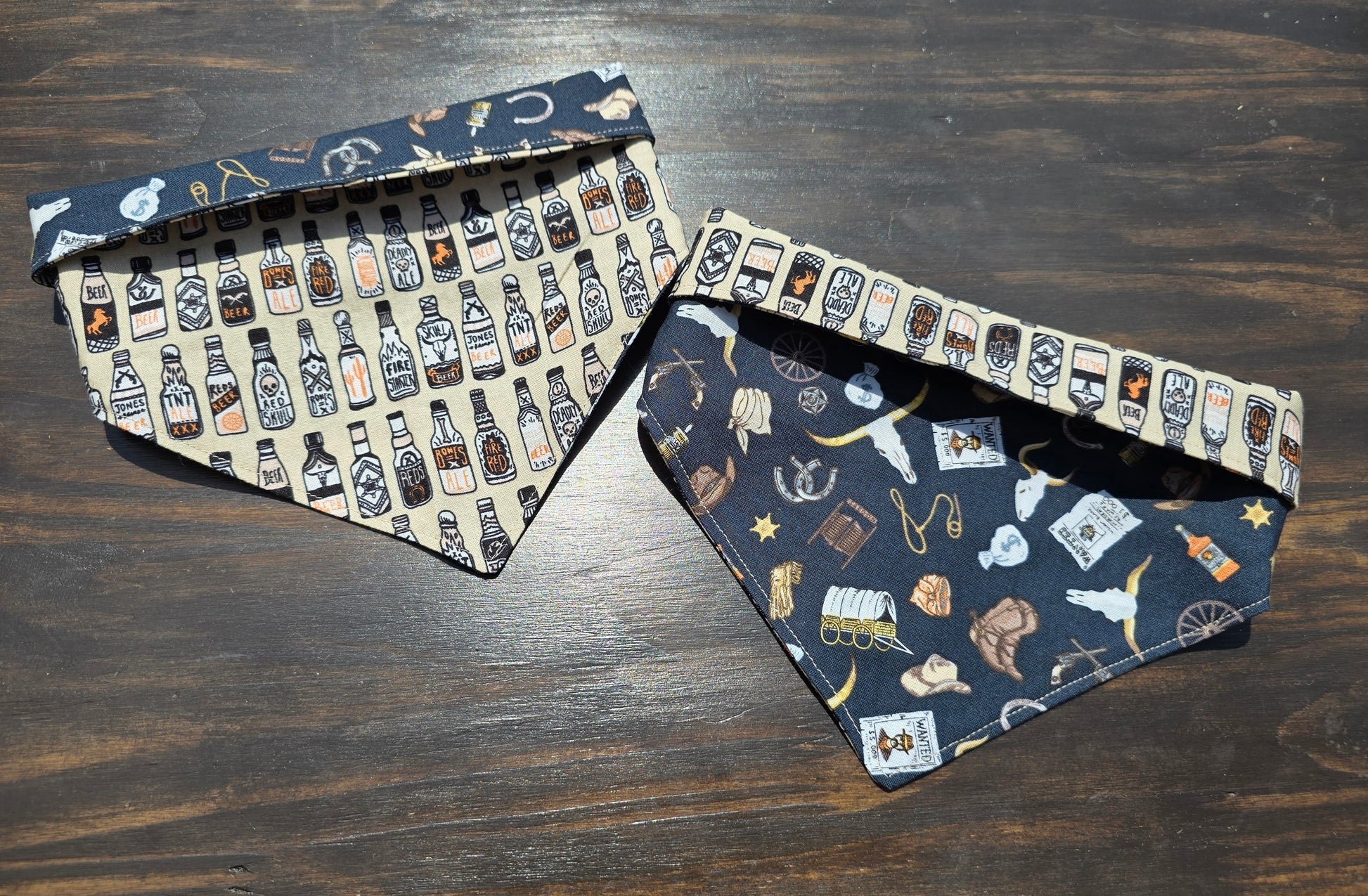 Reversible Snap-on Pet Bandana: Personalize it any way you like! It's the perfect everyday bandana! This bandana has spooky-themed beer bottles on one side, while the other is old west themed! Add personalization to any bandana with the "Bandana Personalization" listing